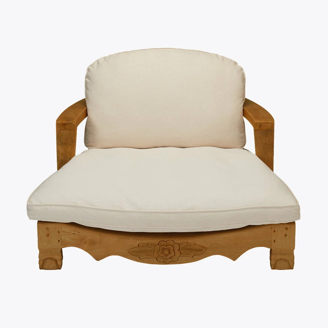 The dimensions and design of The Raja Meditation Chair are otherwise the same as the Serenity Chair so both will work equally well for supporting proper posture in meditation. The cream cushions are kapok filled, 100% cotton. Raja Meditation Chair Covers can be purchased separately and are available in a variety of colors.