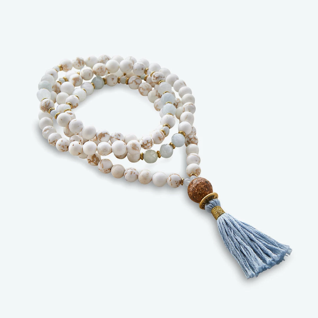 - White magnesite & aquamarine with gold-plated brass and picture jasper guru